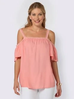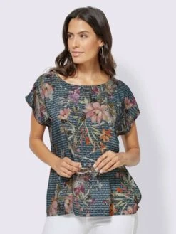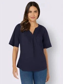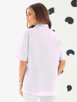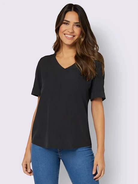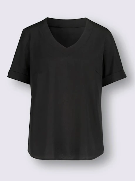Ce chemisier à manches courtes est un partenaire mode extrêmement polyvalent. Col V, revers fixe aux manches courtes et ourlet légèrement arrondi.