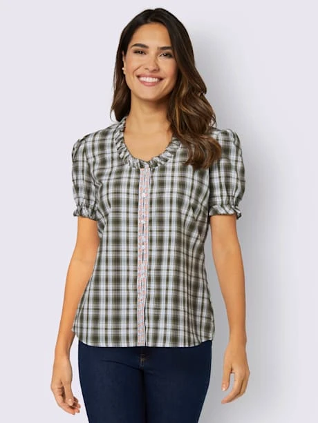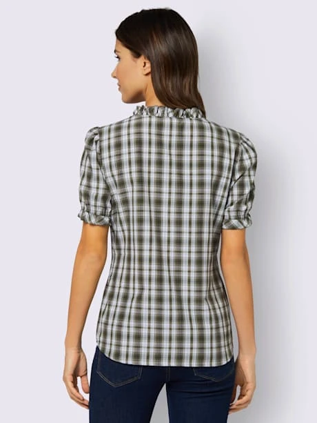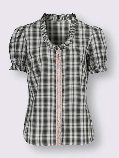 Chemisier à carreaux aux détails tendance : encolure ronde avec volants et ruban décoratif le long de la patte de boutonnage. Manches bouffantes légèrement froncées aux épaules et finitions élastiques. Ourlet arrondi pour un port décontracté hors du pantalon.