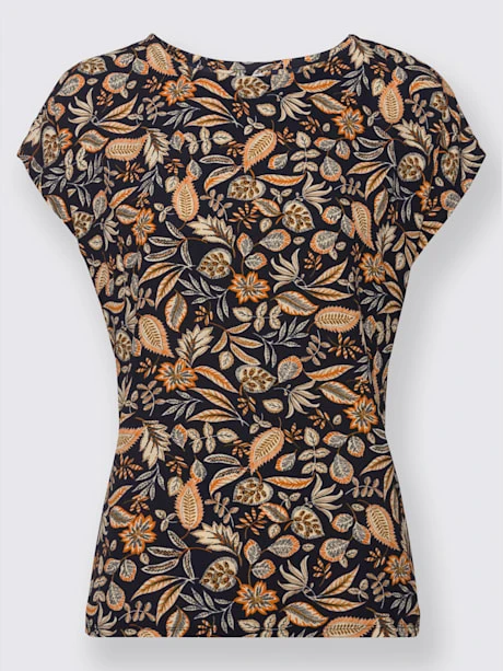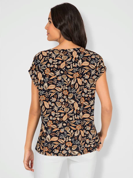 Superbe motif feuilles, qualité crêpe légère, facile à entretenir et à enfiler : ce chemisier exauce tous vos souhaits ! Encolure ronde passepoilée et mancherons.