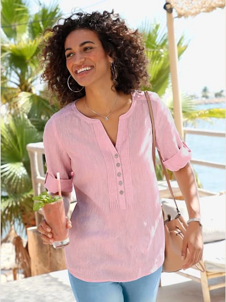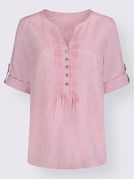 Particulièrement agréable à porter par temps chaud ! Chemisier en lin affinant la silhouette. Nervures décoratives et encolure en V avec patte de boutonnage flatteuse. Manches 3/4 à retrousser. Ourlet arrondi.