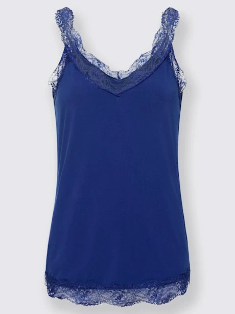 Débardeur raffiné idéal sous une veste en tricot ou un blazer. Dentelle à l’encolure, aux bretelles et à l’ourlet. Qualité extensible légèrement brillante.