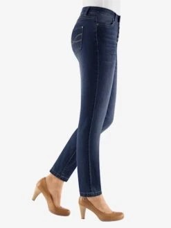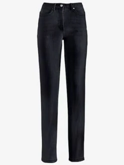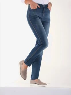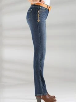 Il va vous plaire ! Jean fait pour les amateurs de denim. Léger délavage. Ceinture élastique latérale. Passants. Fermeture à glissière et bouton. Poches devant. Empiècement pour une coupe parfaite ! Broderie le long des coutures latérales. Largeur pieds env. 32 cm.
