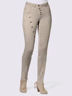 Jean rehaussé d’une couture fantaisie sur une cuisse et d’une patte de boutonnage décorative sur l’autre. Stature réduite, ceinture gainante avec passants et fermeture boutonnée devant. Coupe 5 poches : 2 poches et poche gousset supplémentaire devant, 2 poches arrière plaquées. Largeur pieds env. 28 cm.