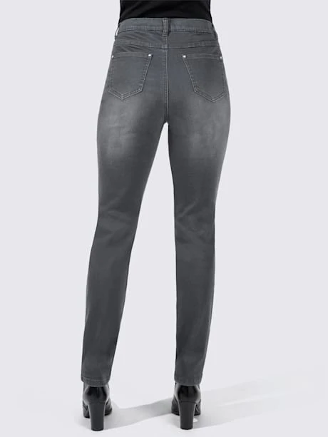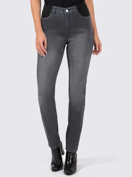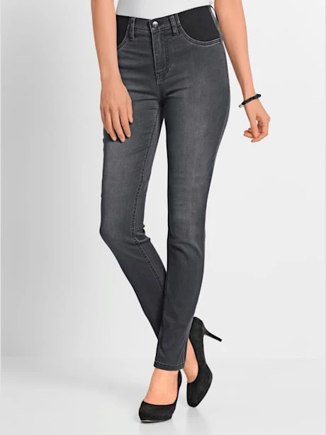 Jean très confortable en qualité extensible douce et empiècements extensibles en forme de poches sur les côtés. Ceinture gainante à passants, fermeture à glissière et bouton. Empiècement au dos et 2 poches arrière plaquées. Largeur pieds env. 32 cm.