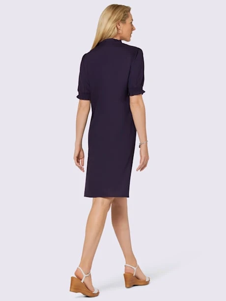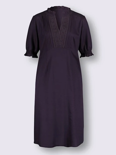 Vous ferez des envieuses avec cette superbe robe au joli motif à pois tissé. Finition raffinée dans les détails avec des volants sur le petit col montant et une broderie ajourée le long de la fente en V ouverte. Plis fantaisie des épaules jusqu’à la couture à la taille pour un effet visuel affinant. Les manches à finition smockée sont froncées au niveau de la couture des épaules et dissimulent ainsi le haut des bras. 2 poches cousues pratiques et matière tissée fluide pour un effet mode parfait.