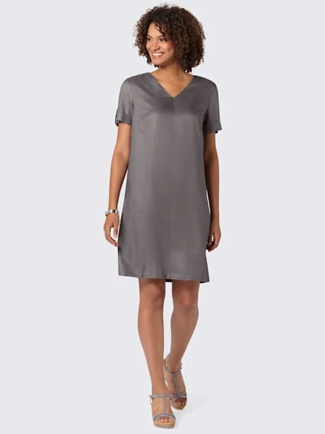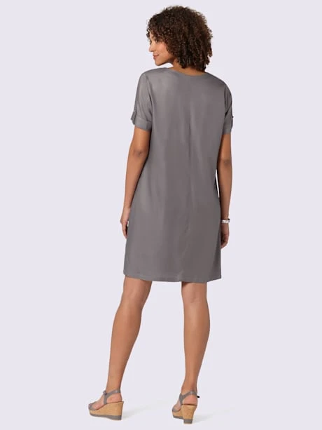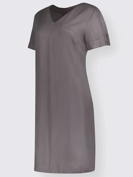 Le bien-être et l`élégance à enfiler ! Cette robe a tout du nouveau favori de l`été ! Superbe qualité en viscose twill de qualité : très agréable à porter, douce et fluide. Encolure en V, pinces poitrine, manches courtes à revers et bride décorative.