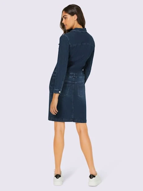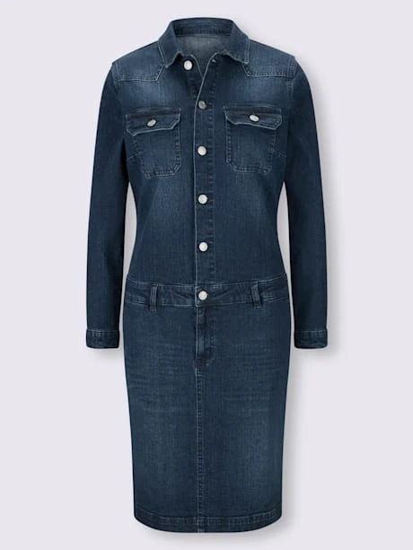 Superbe robe en jean tendance en qualité denim douce. Coupe légèrement cintrée. Col à revers ouvert et poches poitrine plaquées. Patte de boutonnage longue jusqu’aux hanches et glissière. Poches latérales fendues. Manchettes boutonnées. Passants. Soutient l’initiative Cotton made in Africa.