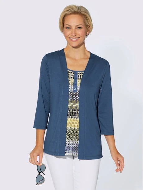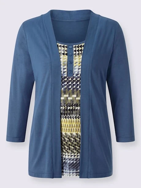 T-shirt à l’aspect 2 en 1 tendance, qualité viscose respirante. Intérieur au joli imprimé avec encolure ronde passepoilée et fausse patte de boutonnage avec boutons décoratifs. Veste à la coupe flatteuse ouverte et unie. Manches 3/4.