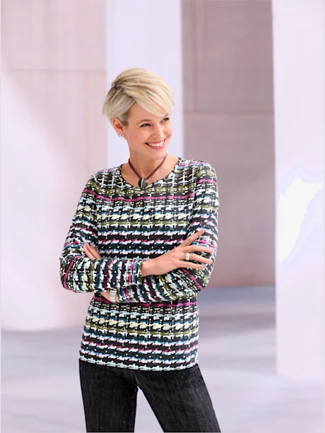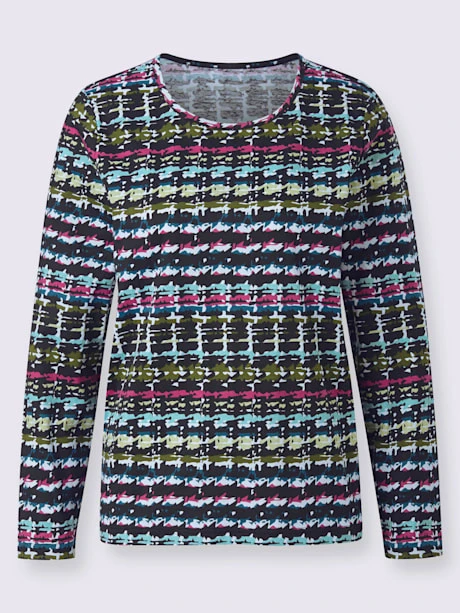 T-shirt au motif graphique moderne très facile à assortir. Encolure ronde passepoilée, manches longues et qualité jersey fin facile à entretenir.