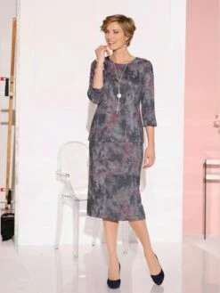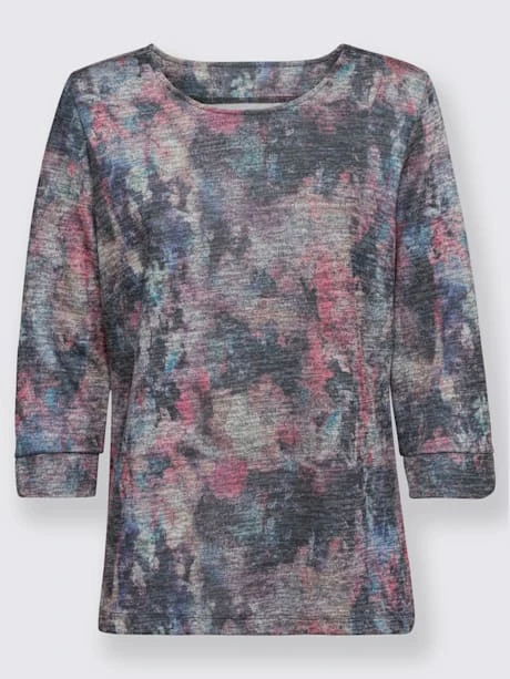 Imprimé batik fantaisie ! T-shirt à encolure ronde et pinces poitrine modelantes. Fentes arrondies à la finition des manches 3/4. Jersey fin.