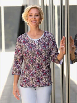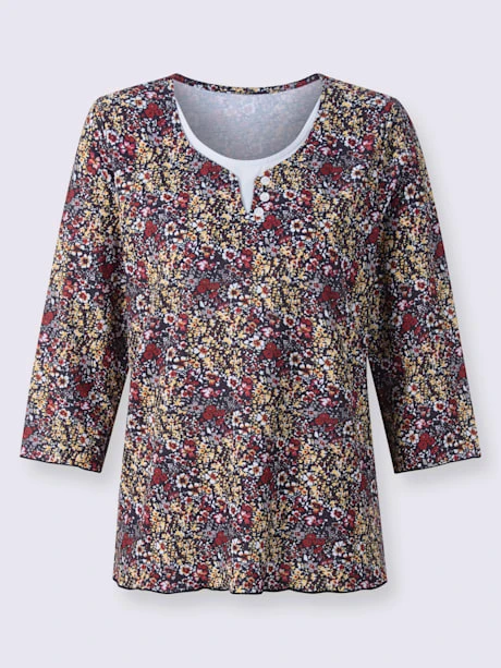 Aspect 2 en 1 tendance : T-shirt au motif floral avec empiècement contrasté et boutons à l’encolure. Manches 3/4. Entretien facile.