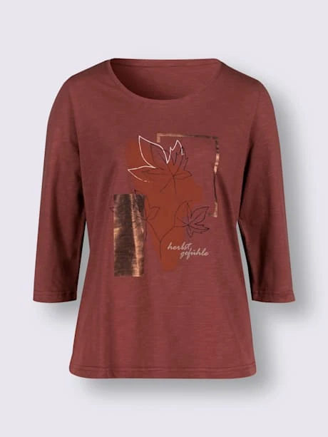 Oublions les fleurs et les pétales : vive les feuilles ! Ce T-shirt nous prouve une fois de plus que la nature est une belle source d’inspiration. Imprimé placé devant. Manches 3/4. Qualité fil flammé.
