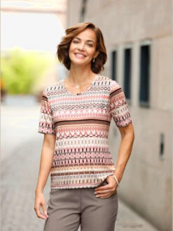 Motif graphique : T-shirt en viscose respirante facile à assortir et facile d’entretien. Encolure ronde passepoilée et manches courtes.