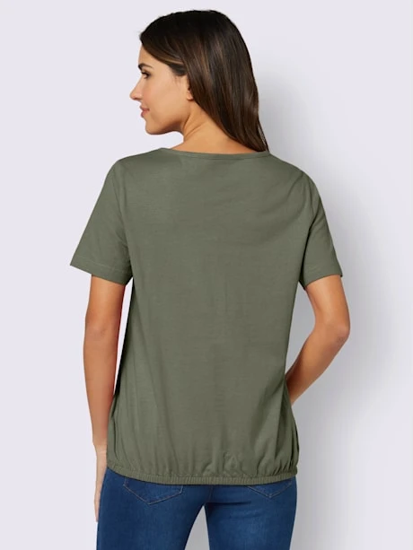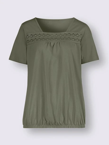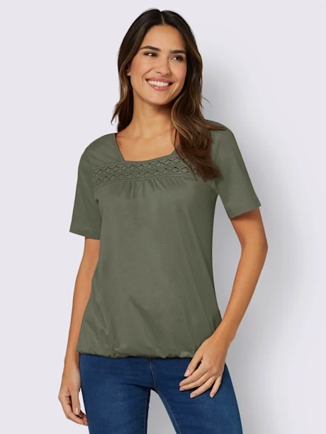 Lorsque la dentelle délicate rencontre un coton agréable à porter : magnifique T-shirt à manches courtes ! Encolure carrée avec empiècement dentelle devant. Ourlet élastique pour une coupe affinante.