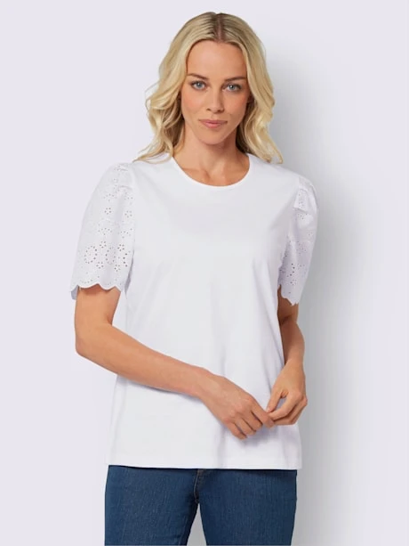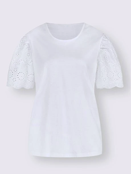 Ce charmant T-shirt est magnifique ! Les manches bouffantes tissées mettent en valeur la broderie ajourée et les finitions ondulées.