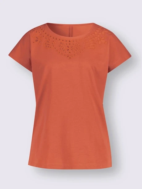T-shirt à manches courtes avec jolie broderie ajourée sous l’encolure ronde. Mancherons et ourlet droit.