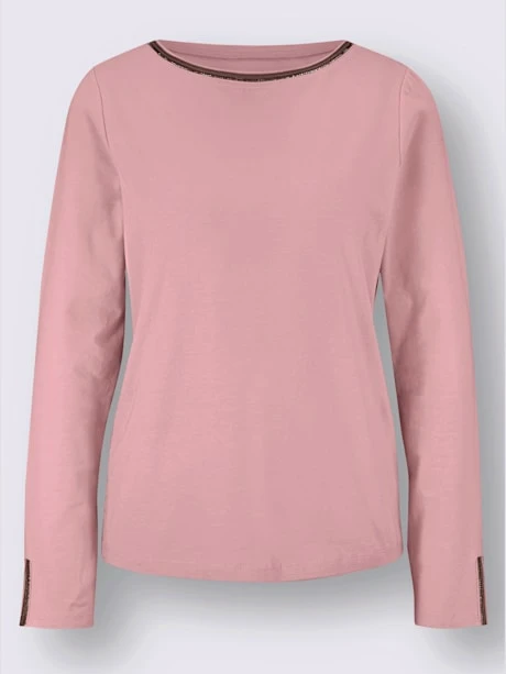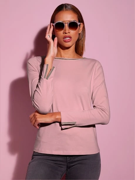 Les bandes décoratives avec des strass chatoyants à l’encolure en U et aux poignets des manches longues avec fente sont un élément spécial de ce T-shirt.