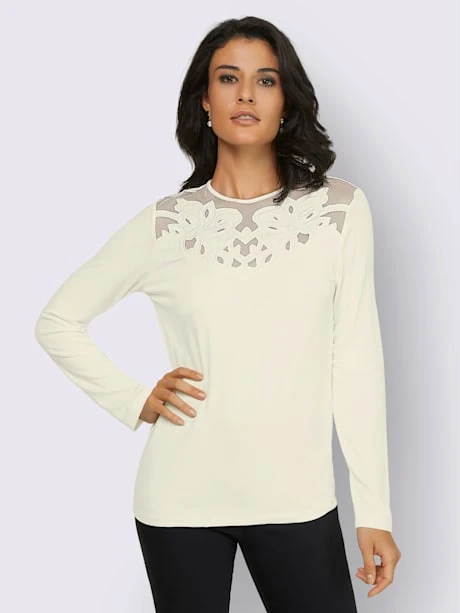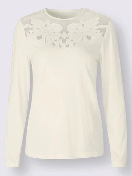 Détails de charme ! Ce t-shirt le prouve : l’empiècement en maille avec des motifs floraux sur l’encolure sublime la peau.