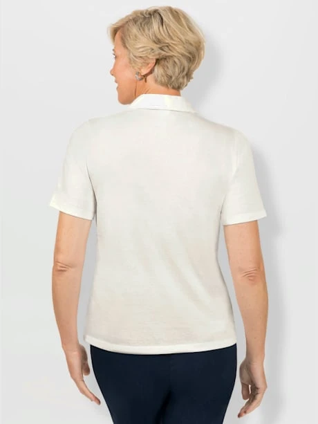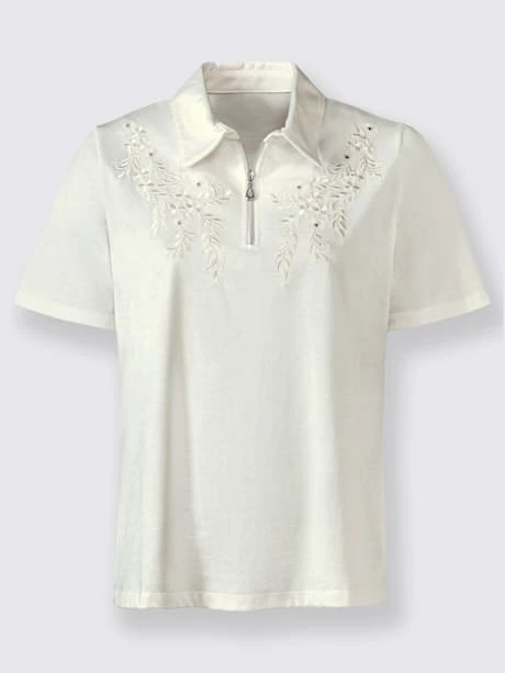 T-shirt très confortable et légèrement brillant grâce à la grande qualité jersey. Jolie broderie avec petites pierres brillantes fantaisie devant. Col polo à glissière. En achetant ce vêtement, vous soutenez l’initiative « Cotton made in Africa ».