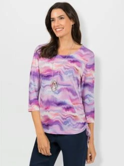 Un T-shirt qui fait sensation : laissez-vous séduire par l’imprimé numérique fantaisie aux coloris vifs ! Encolure ronde, manches 3/4 et double coulisse avec liens élastiqués à froncer sur le côté de la base. Matière extensible douce et facile à entretenir.