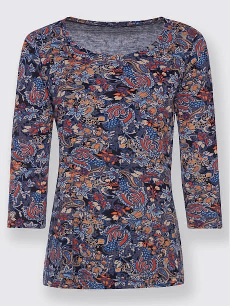 Joli T-shirt au motif floral harmonieux. Encolure ronde et manches 3/4. Mélange de matières particulièrement doux et agréable à porter.