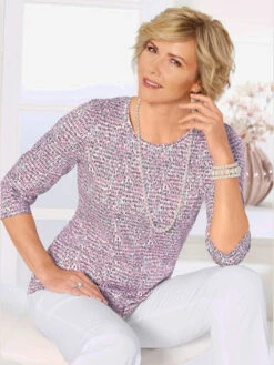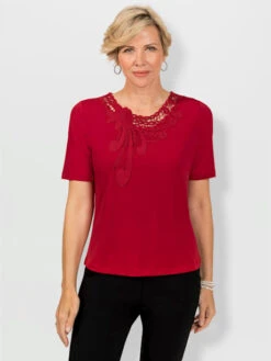 Tout simplement sublime et féminin : t-shirt en qualité modal douce. Dentelle transparente raffinée à l’encolure ronde avec petit V, épaules et manches longues laissant transparaître la peau. Joli détail : le ruban en dentelle le long du revers à l’encolure et sur les grandes manchettes.